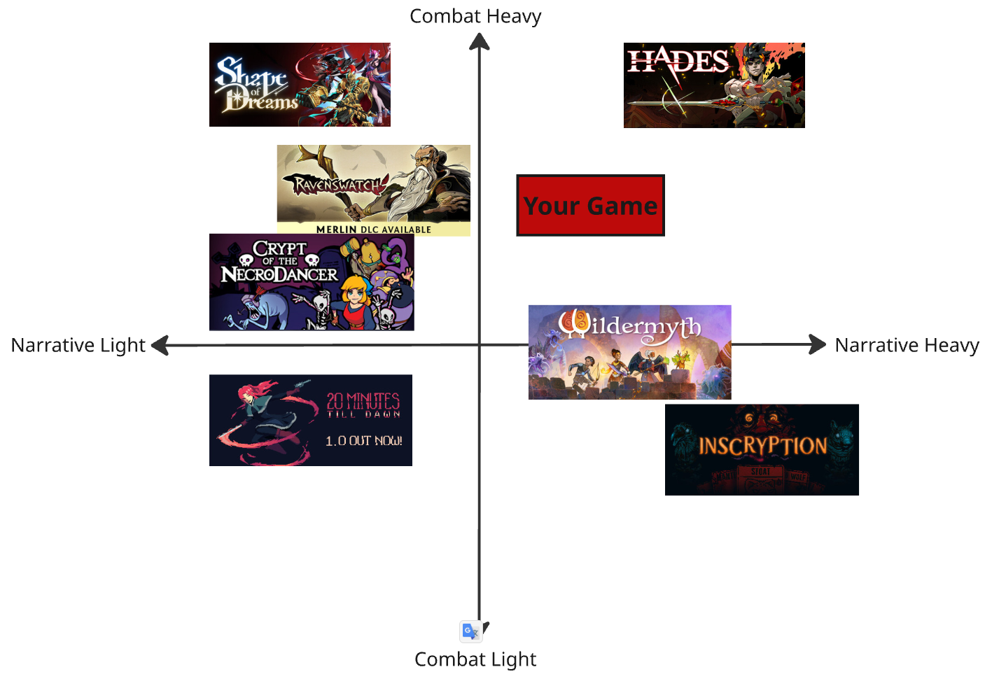 In the example above, I've mapped out several roguelike games based on two key dimensions: how combat-heavy they are and how narrative-rich they are. Let's say you want your roguelike game to have just enough storyline with fleshed-out combat mechanics. In this case, you'd position yourself in the upper right quadrant, closer to Hades and the Y-axis, but slightly further away from Wildermyth, which is relatively light on combat mechanics.