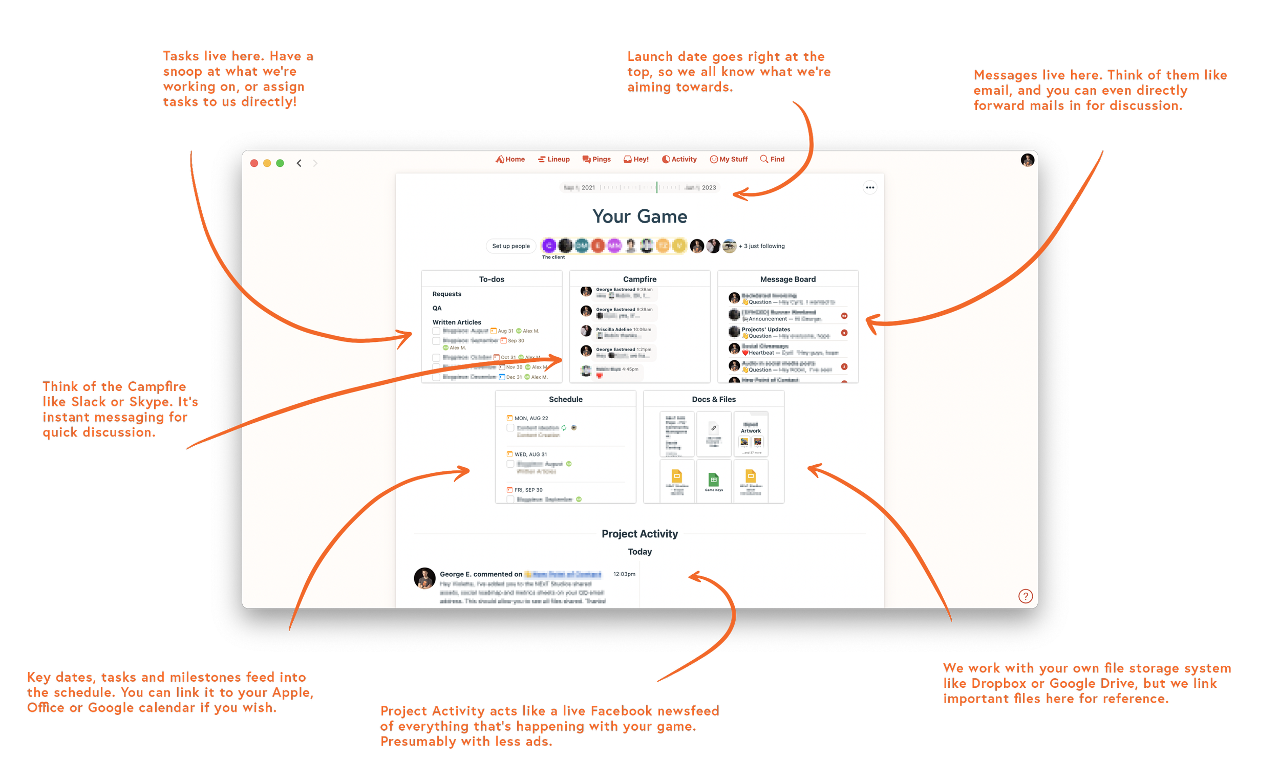 Every team has their own project management tools and you probably already have many of your own. With so many services, how do we find what we need quickly and efficiently? We tie everything into one place, Basecamp, which serves as our central hub for task management, planning and collaboration. You’re welcome to invite as many members of your team as you like. Use it freely, or leave it well alone. The choice is yours!